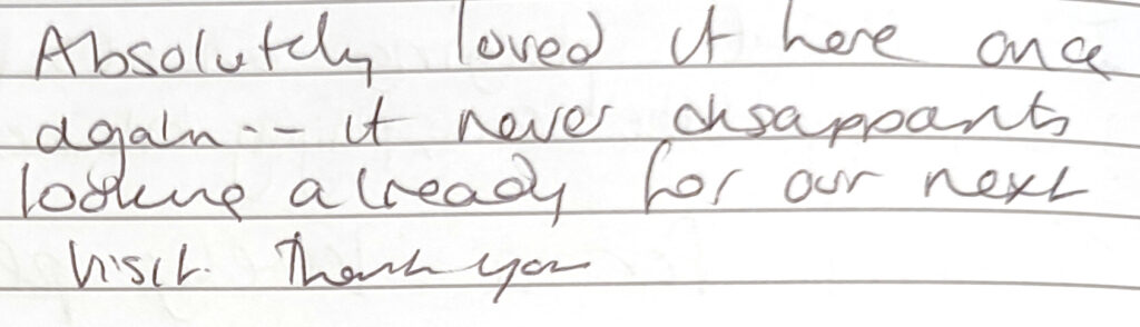 Absolutely loved it here once again – it never disappoints. Looking already for our next visit. Thank you.”