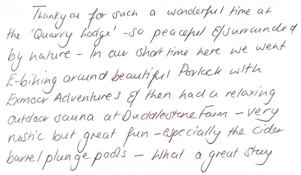 “Thankyou for such a wonderful time at the ‘Quarry Lodge’ – so peaceful and surrounded by nature. In our short time here we went E-biking around beautiful Porlock with Exmoor Adventures and then had a relaxing outdoor sauna at Duddlestone Farm – very rustic, but great fun – especially the cider barrel plunge pools – what a great stay. Thankyou.”