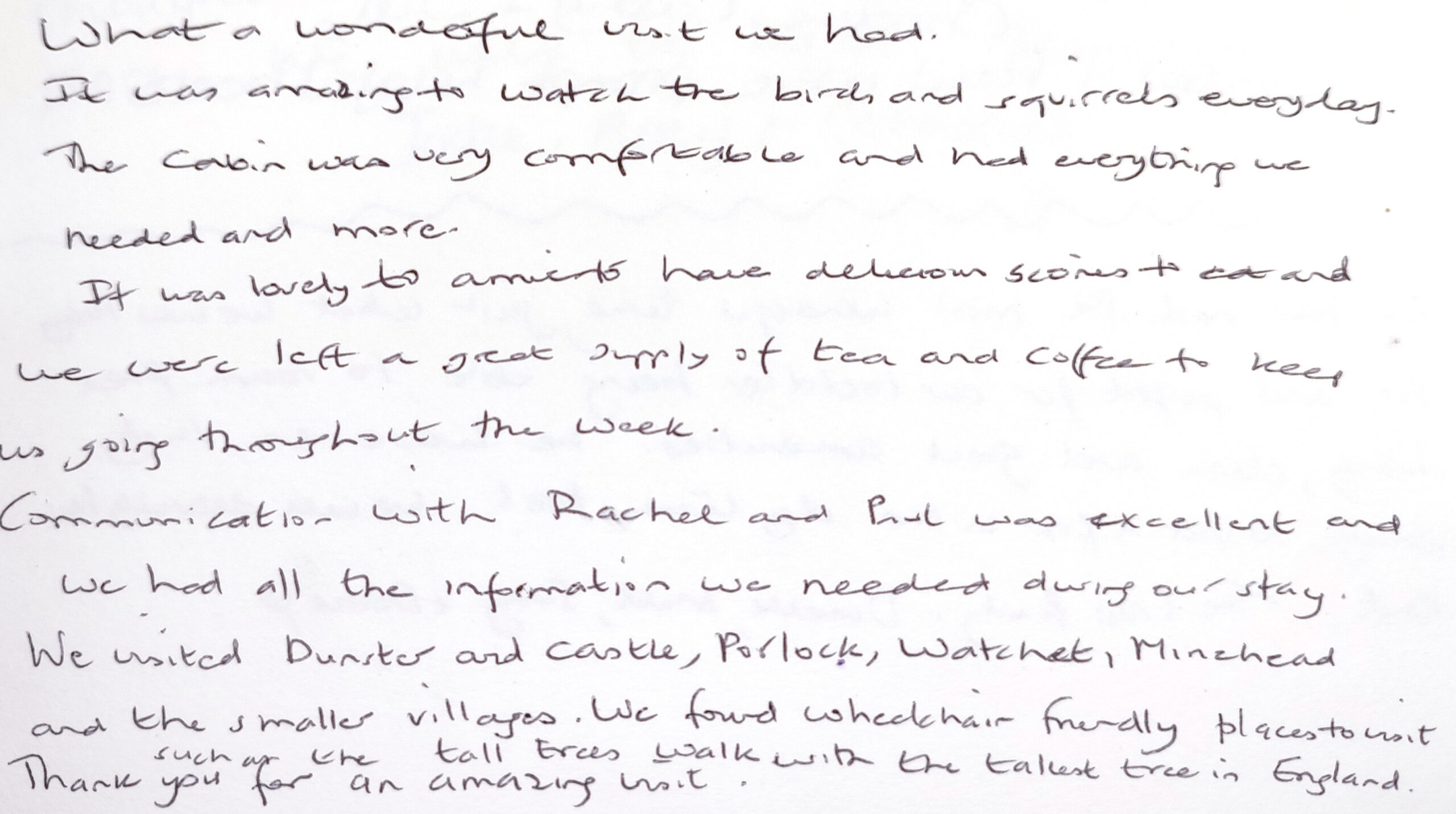 “What a wonderful visit we had. It was amazing to watch the birds and squirrels everyday. The cabin was very comfortable and had everything we needed and more. It was lovely to arrive to have delicious scones to eat and we were left a great supply of tea and coffee to keep us going throughout the week. Communication with Rachel and Paul was excellent and we had all the information we needed during our stay. We visited Dunster and castle, Porlock, Watchet, Minehead and the smaller villages. We found wheelchair friendly places to visit such as the tall trees walk with the tallest tree in England. Thank you for an amazing visit.”