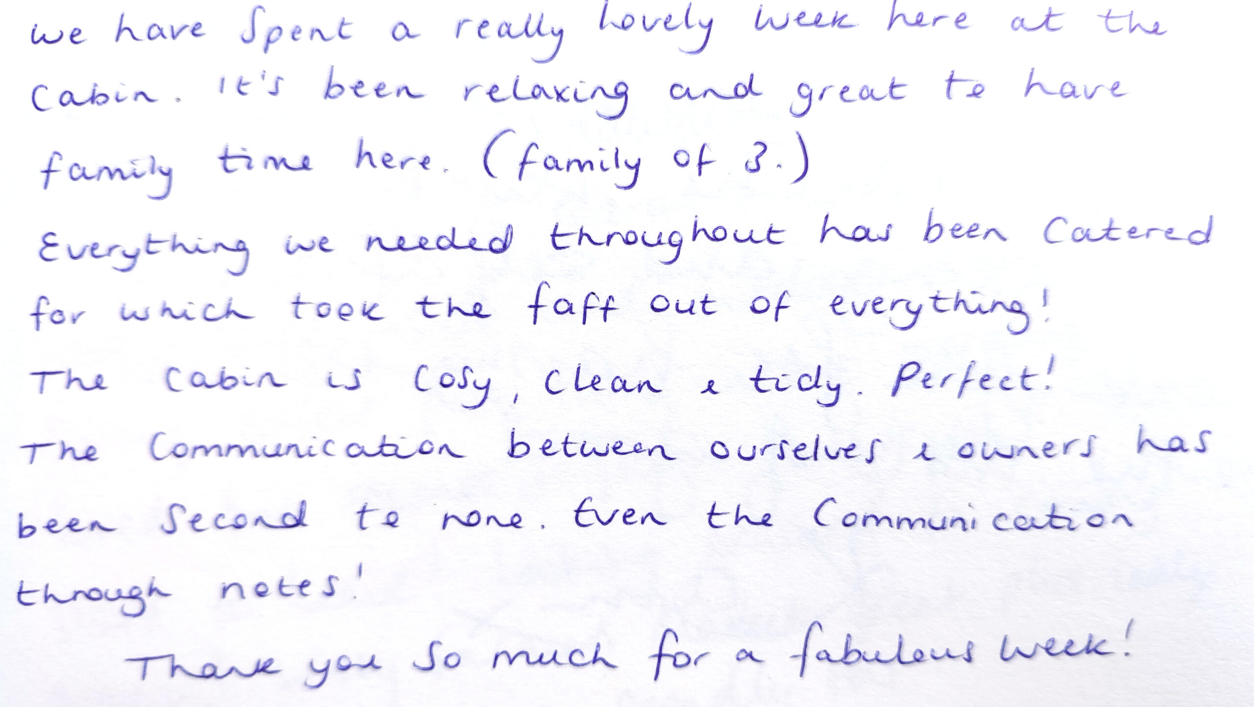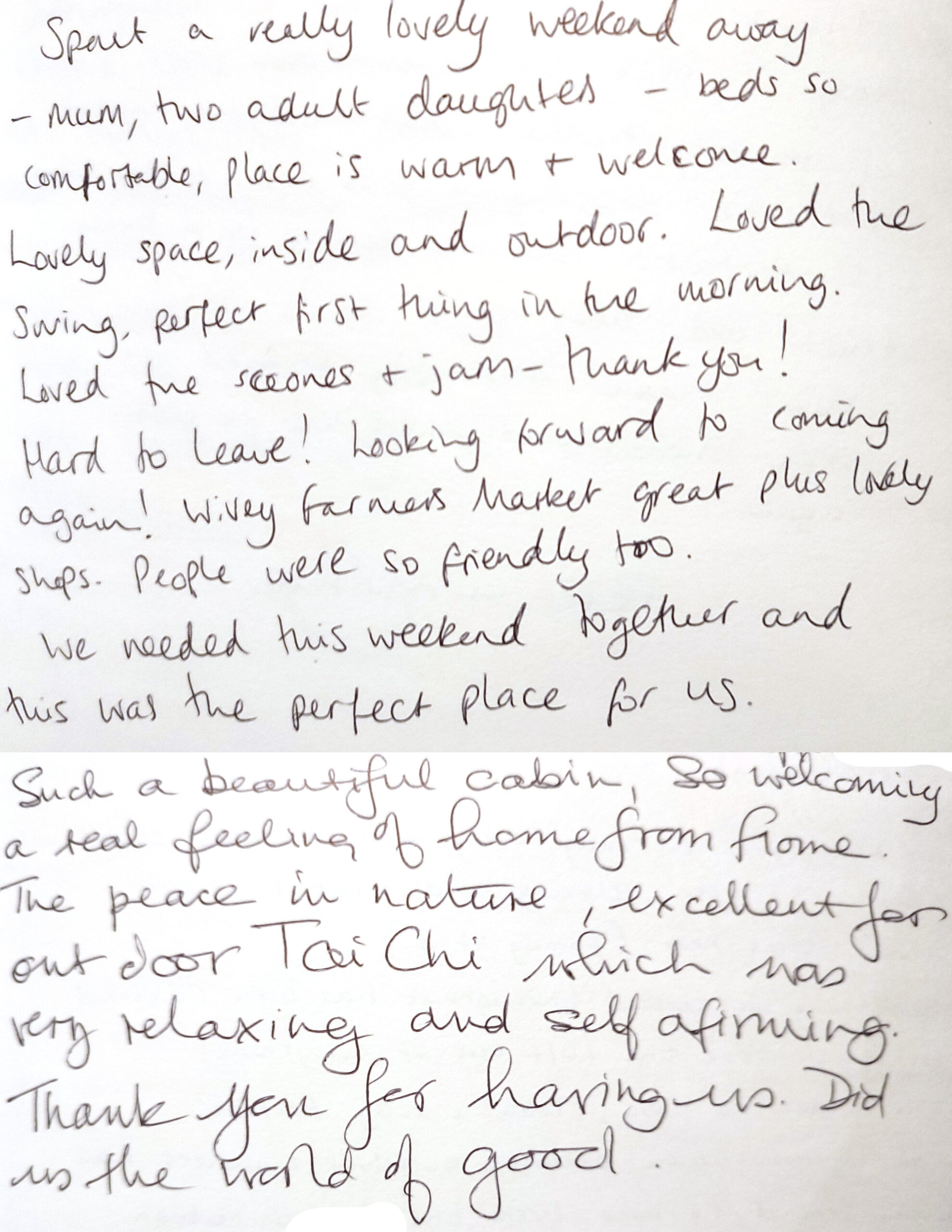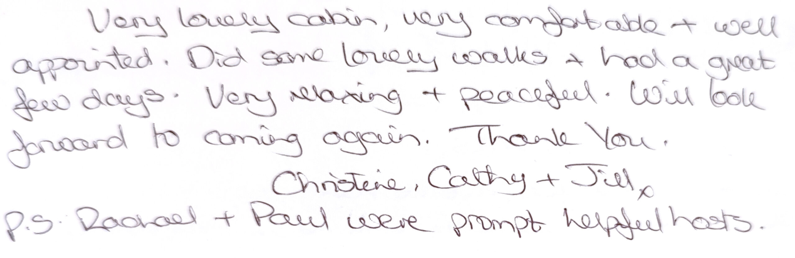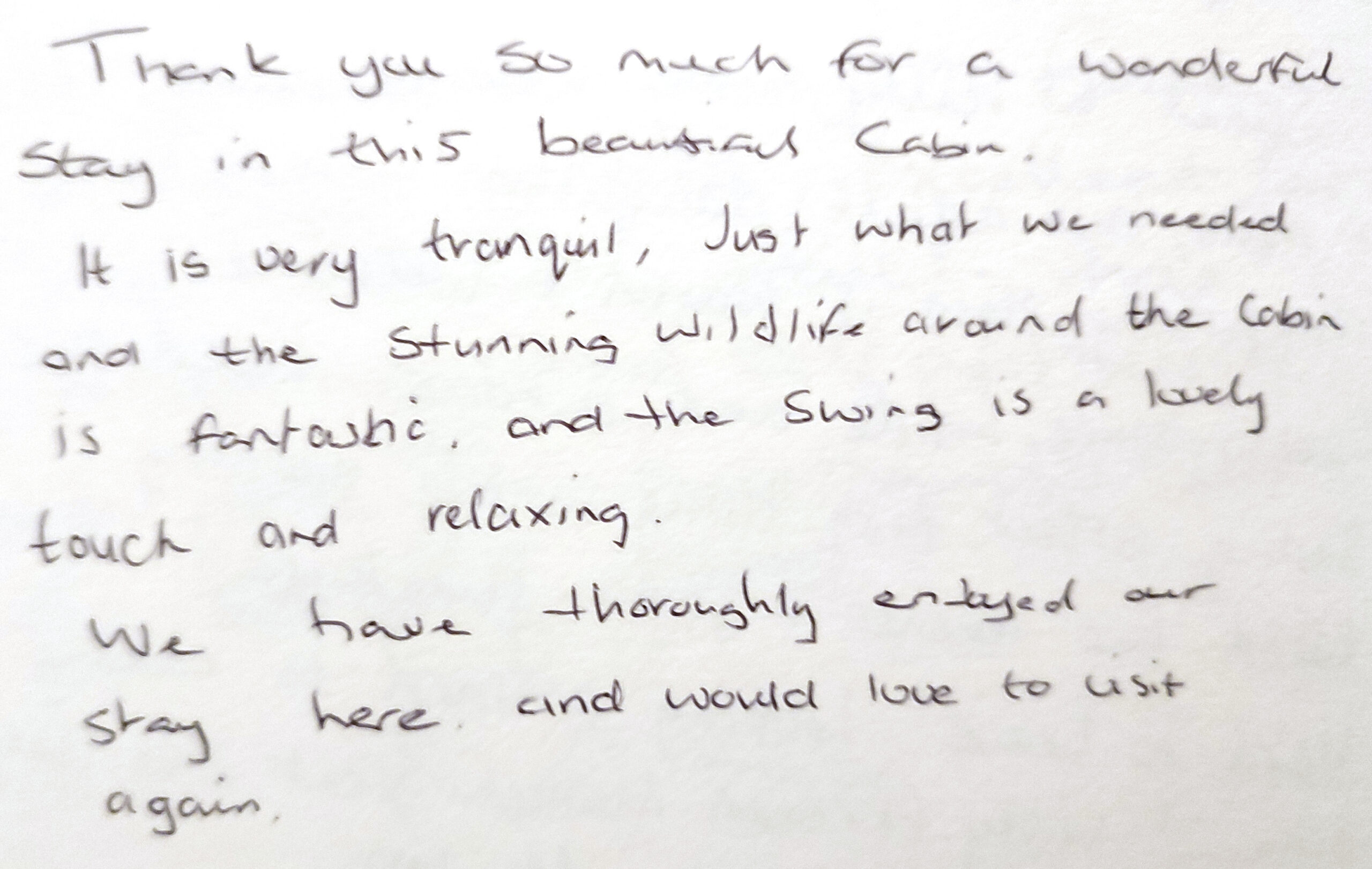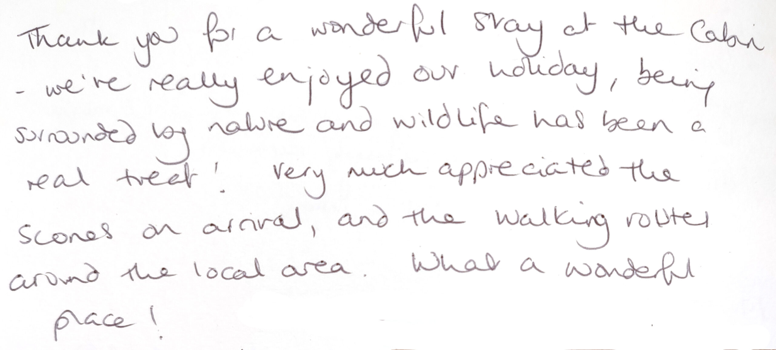 “Thank you for a wonderful stay at the cabin – we’ve really enjoyed our holiday, being surrounded by nature and wildlife has been a real treat! Very much appreciated the scones on arrival, and the walking routes around the local area. What a wonderful place!