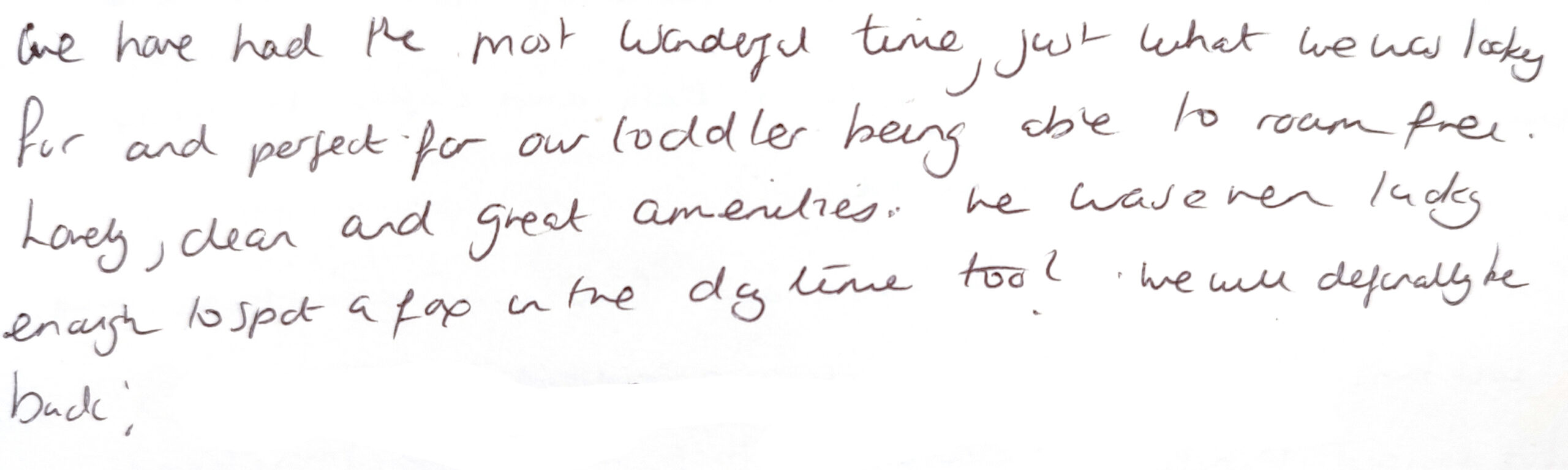 “The beds were cosy, but I got a little twisted. The garden was awesome. I loved the swing. The hamak was good., but I got tipped off a few times. Fank you for our stay” (Rowan, 8)