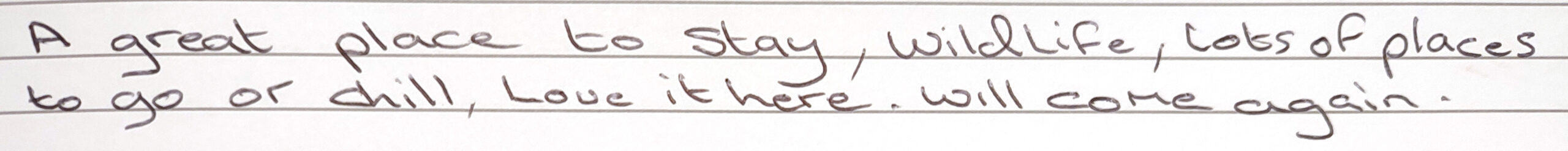 “We had a lovely time. This was a surprise birthday present to get away from a busy life! It was very relaxing and peaceful. The wildlife was lovely and we enjoyed writing down what we had seen in the wildlife book. The cabin was lovely and the facilities. We have already said we will be returning. Thank you for a lovely stay :)”