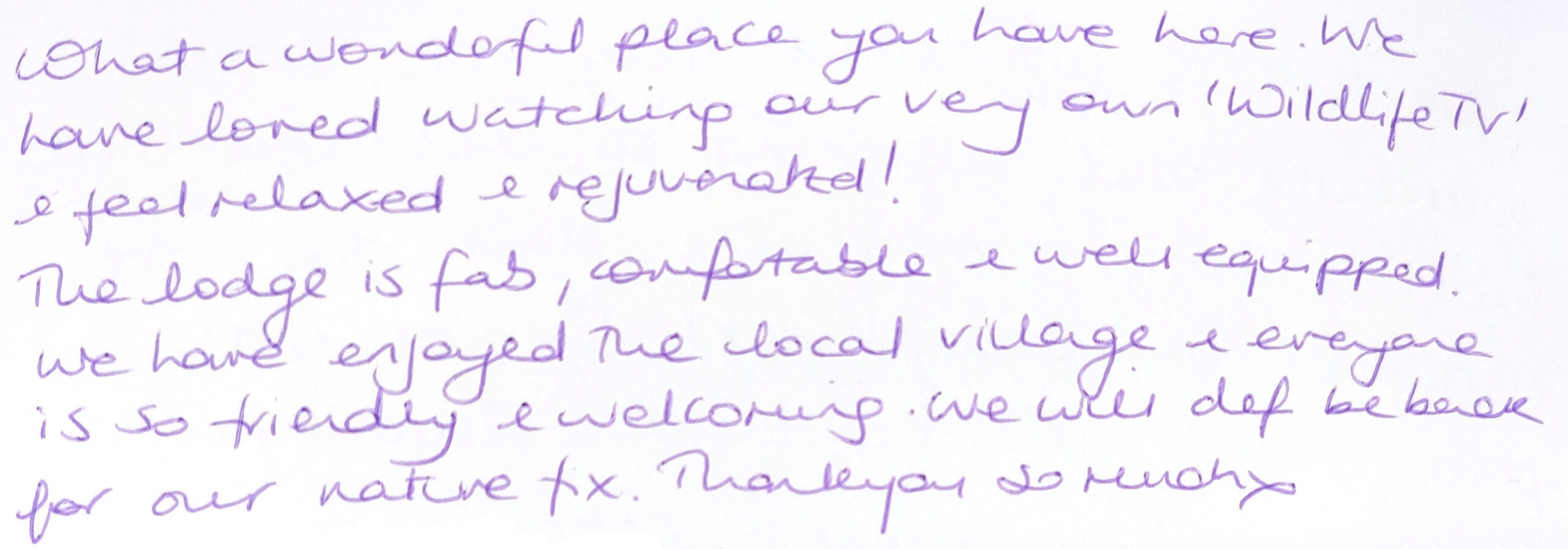 “What a wonderful place you have here. We have loved watching our very own ‘Wildlife TV’ and feel relaxed and rejuvenated! The lodge is fab, comfortable and well equipped. We have enjoyed the local village and everyone is so friendly and welcoming. We will definitely be back for our nature fix. Thankyou so much.”