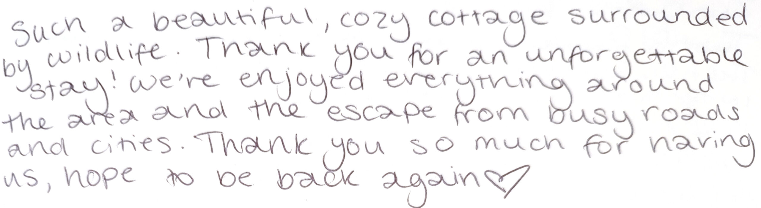 “Such a beautiful cozy cottage surrounded by wildlife. Thank you for an unforgettable stay! We enjoyed everything around the area and the escape from busy roads and cities. Thank you so much for having us; hope to be back again