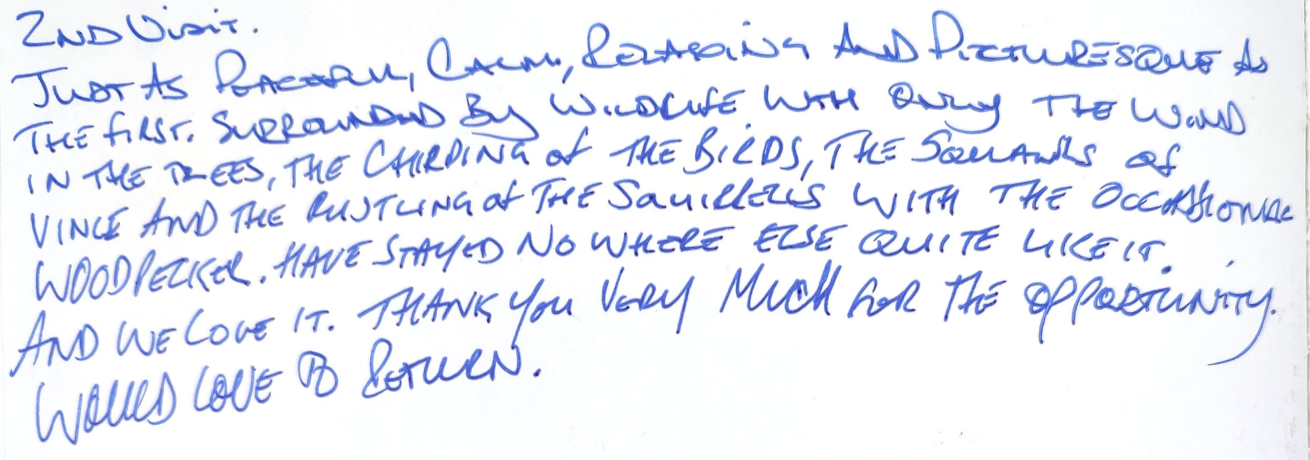 “A tranquil and welcoming stay in a delightful cabin. Surrounded by the wildlife that greets you every morning. A joy to return to after long walks. Highly recommended.”