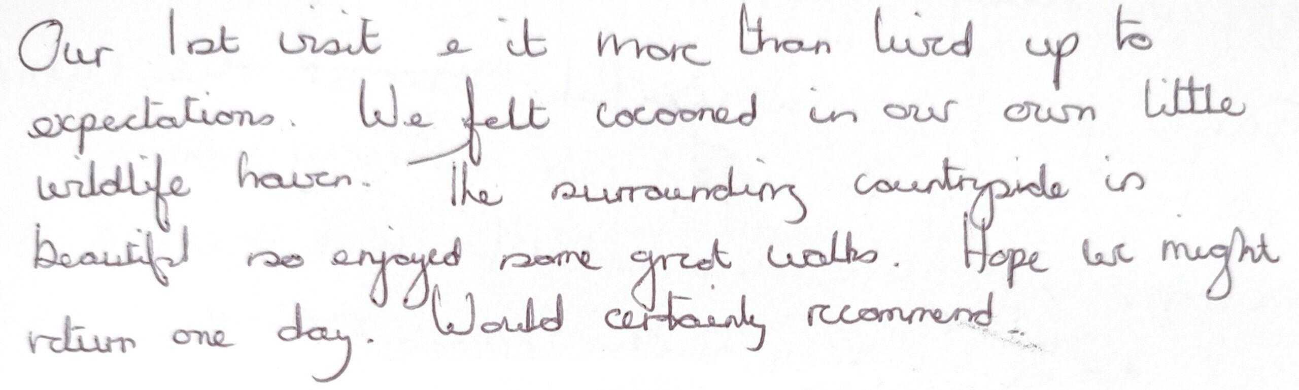 “Our 1st visit and it more than lived up to expectations. We felt cocooned in our own little wildlife haven. The surrounding countryside is beautiful so enjoyed some great walks. Hope we might return one day. Would certainly recommend.”