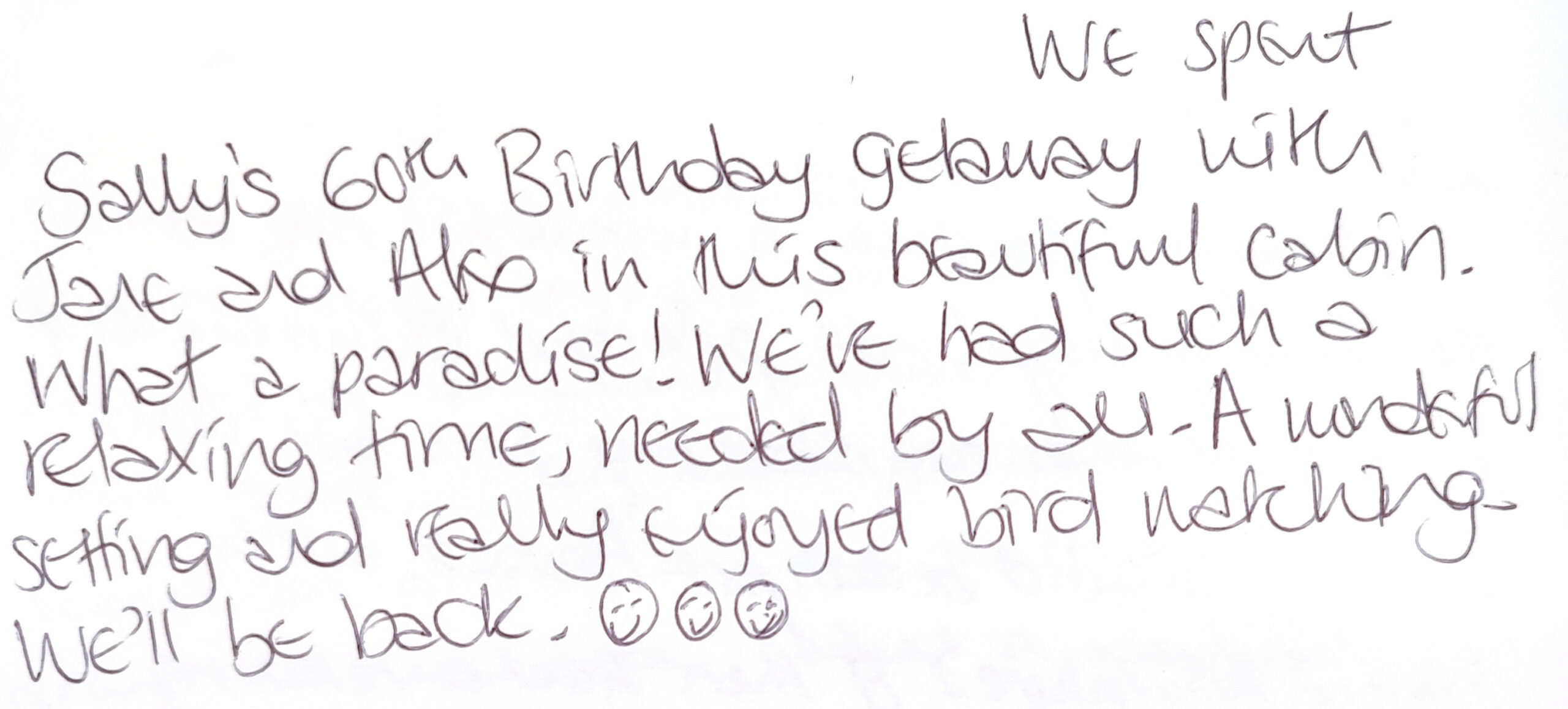 “Sally’s 60th Birthday getaway with Jane and Alex in this beautiful cabin. What a paradise! We’ve had such a relaxing time, needed by all. A wonderful setting and really enjoyed bird watching – we’ll be back”
