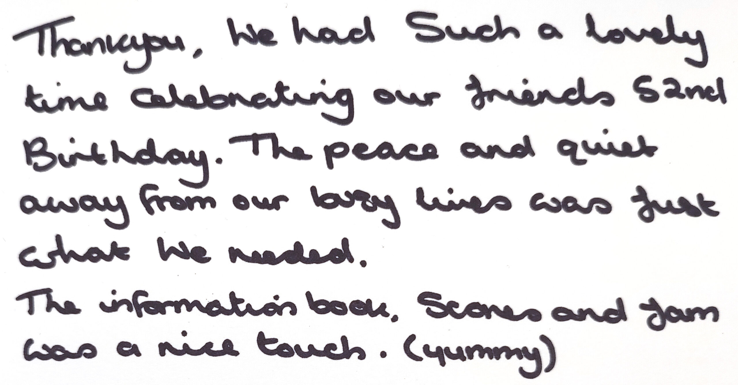 “Thankyou. We had such a lovely time celebrating our friend’s 52nd birthday. The peace and quiet away from our busy lives was just what we needed. The information book, scones and jam was a nice touch (yummy).”