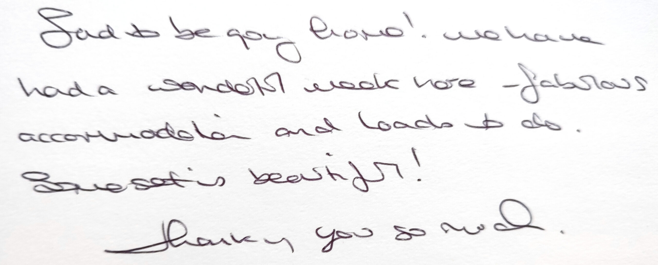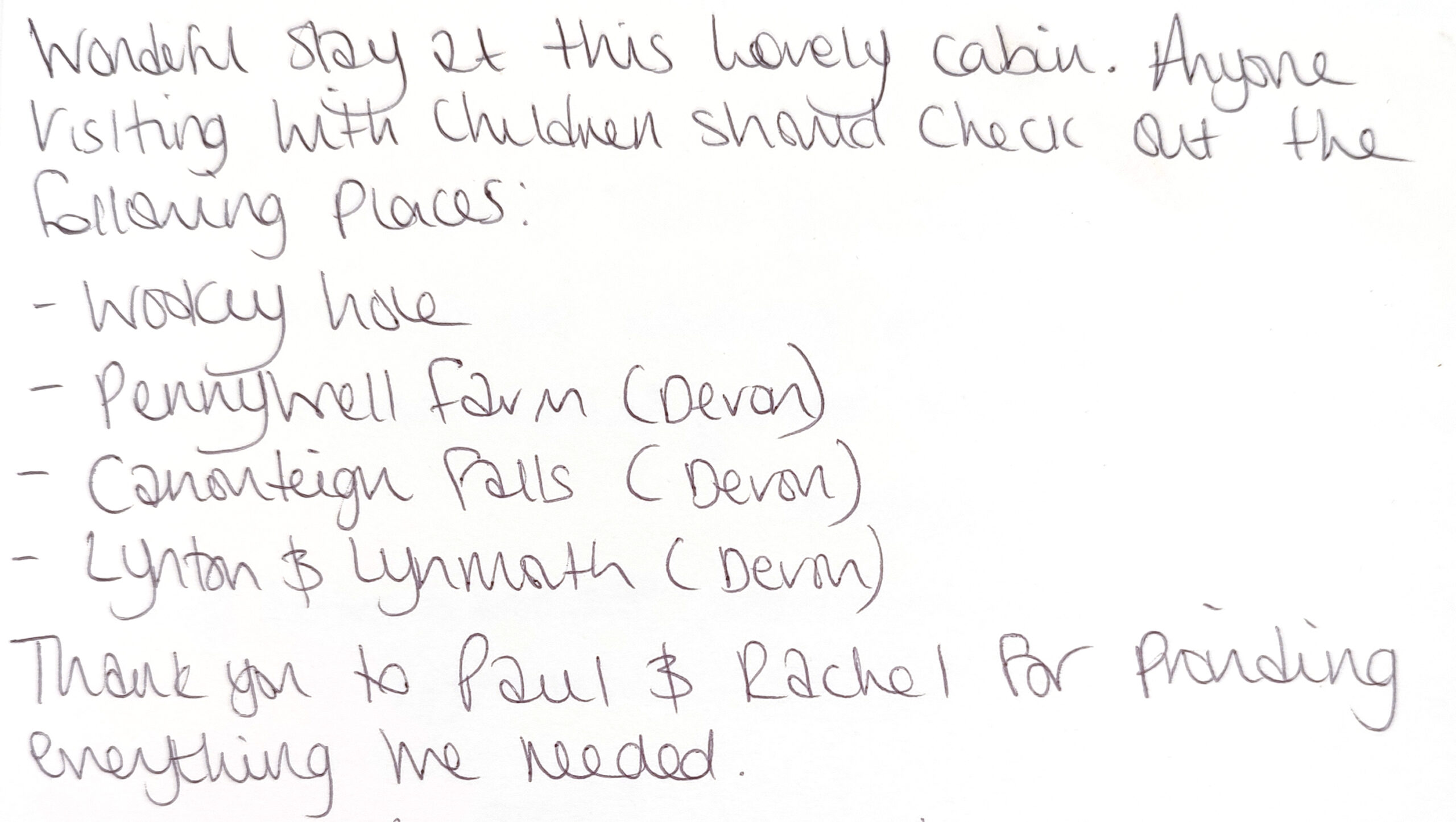 “Thank you for a wonderful stay Paul and Rachel! We had a lovely, relaxing time and will be back!