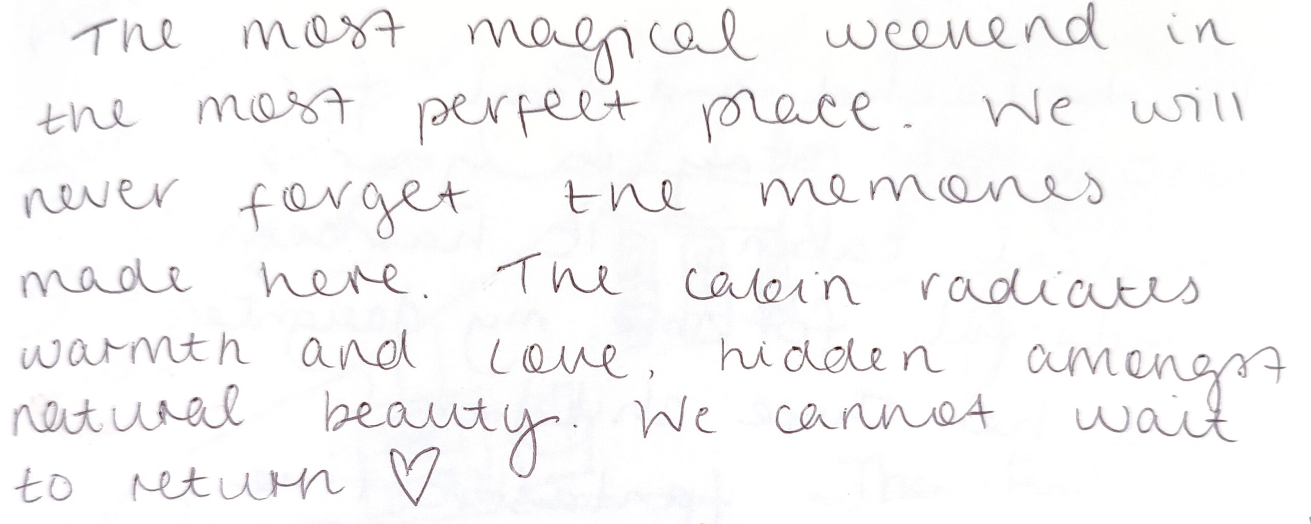 “We have thoroughly enjoyed our short stay here and don’t really want to leave! It’s been cosy, comfortable and has everything we needed. Travelling with a 6, 4 and almost 1 year old in wet and muddy weather, I was particularly grateful to have a washing machine and a tumble dryer! We’d love to come back one day in the summer as the cabin seems very well equipped for warm weather activities. Our children loved the swing, exploring the area around the cabin and the fairy lights! It’s been so nice being able to cook dinner while being able to watch them play outside. Really idyllic. Thank you for the scones too – that was a lovely surprise! Also really appreciated the thoughtful/helpful notes dotted around on various items in the cabin. We hope to come back soon! Thank you Paul and Rachel!”