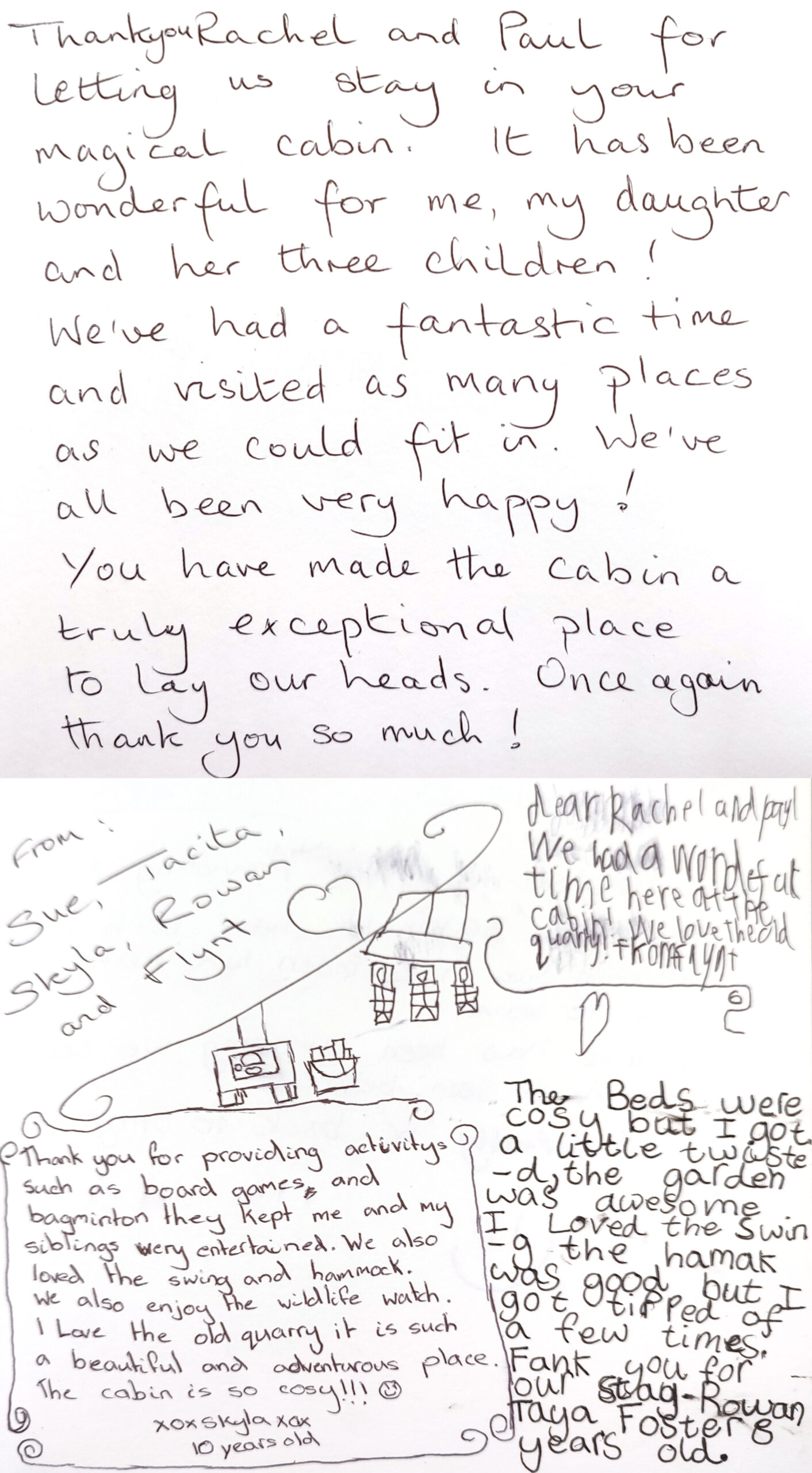 “Thank you for providing activities such as board games and badminton they kept me and my siblings very entertained. We also loved the swing and hammock. We also enjoy the wildlife watch. I love The Old Quarry, it is such a beautiful and adventurous place. The cabin is so cosy!!!” (Skyla, 10)